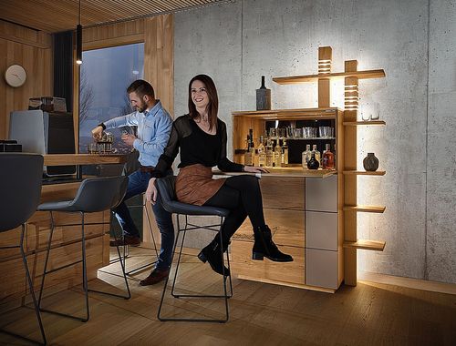 Der charakterstarke Barschrank aus dem Programm SIGNATURA, gefertigt aus massiver Wildeiche, bianco geölt, ist ein echtes Statement für Ihr Zuhause. Die satinierte Glasfront in Kombination mit der Wildeiche und der auffallend schönen Signatur, verleiht dem Möbelstück eine moderne Eleganz, während die integrierte Innenbeleuchtung Ihre Gläser und Spirituosen gekonnt in Szene setzt. Perfekte Kombination aus Funktionalität und Design aus dem Hause WIMMER!