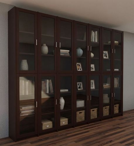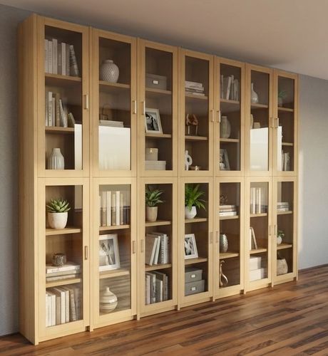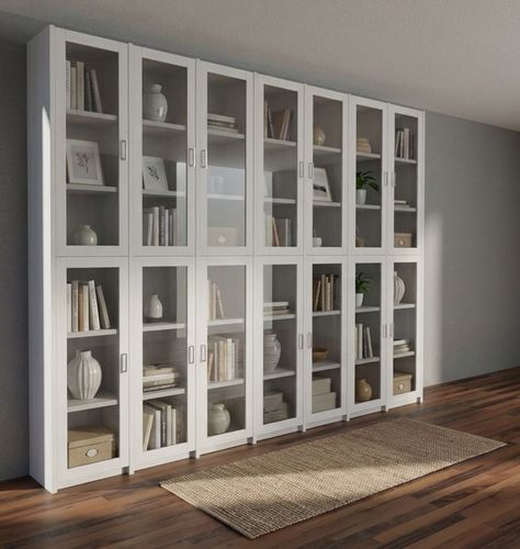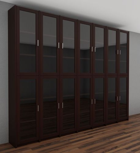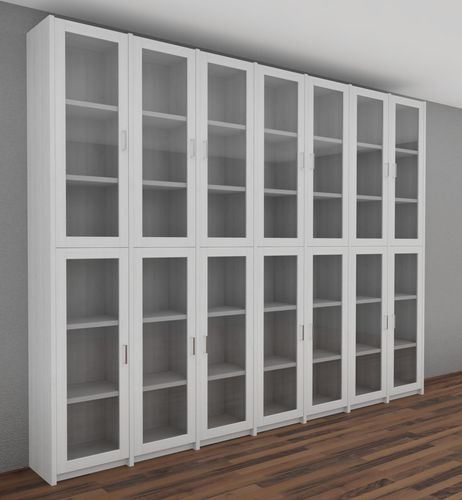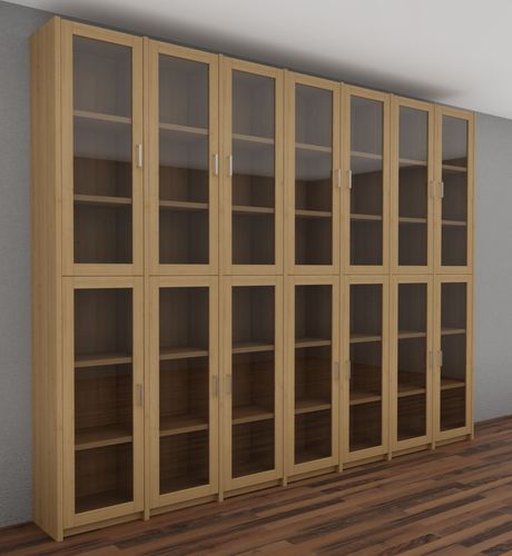 Dieser Bücherschrank verfügt über 14 Glastüren mit jeweils zwei Holz-Einlegeböden.
