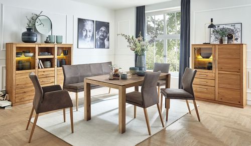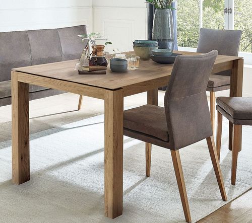 Dieser moderne Esstisch mit seiner Massivholzplatte aus Kernbuche oder Wildeiche und 2 Auszügen mit 47 cm überzeugt im vollen Umfang. Ein absoluter Blickfang in ihrem Esszimmer.