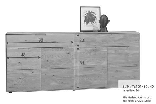 Wäschekommode 4türig mit runden Ecken 200x91x40cm Eiche massiv natur geölt