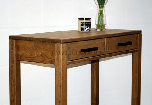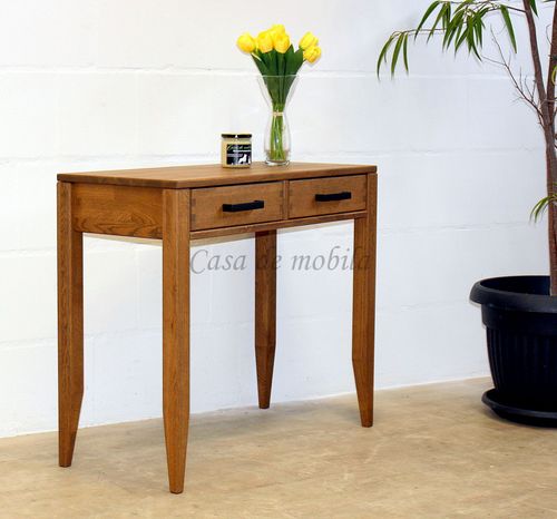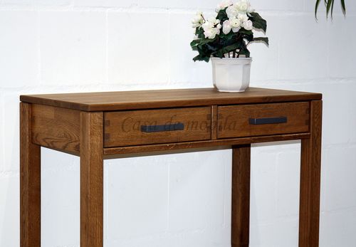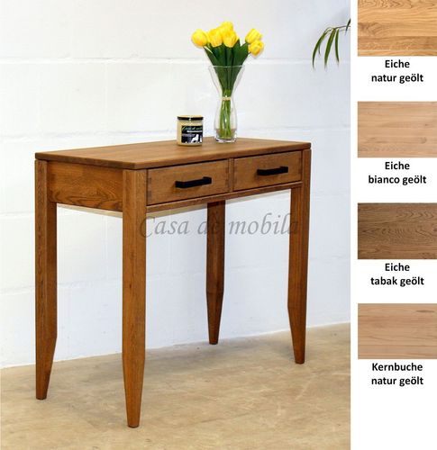 Die Oberfläche des Konsolentisches MIDO ist aus massiver Kernbuche oder Eiche gefertigt und hat eine geölte Oberfläche. Der Tisch ist 90 cm breit und verfügt über zwei Schubladen.