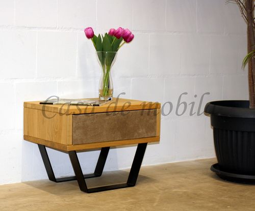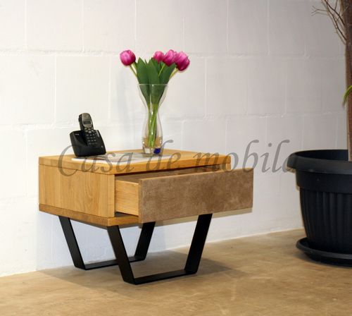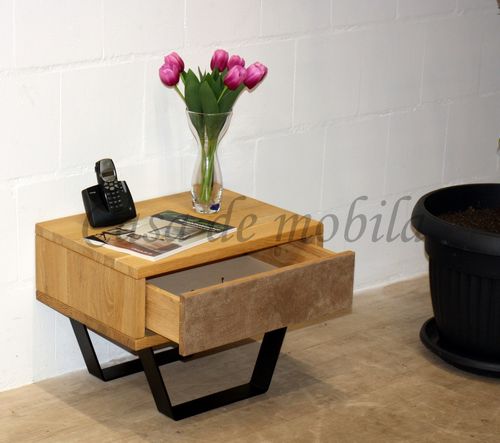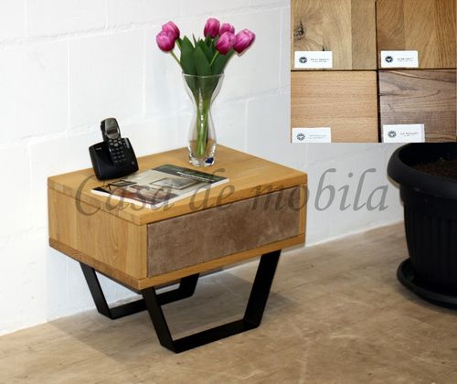 Nachtschrank mit Schubkasten Leder MODERN SLEEP 56x43x40cm Eiche oder Buche massiv Kufen schwarz