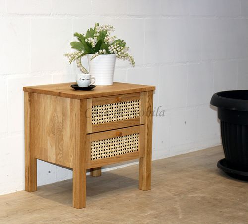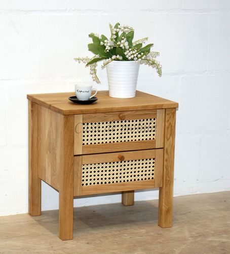 Die Nachtkommode hat 2 Schubkästen mit Schubladenfront aus Wiener Geflecht.