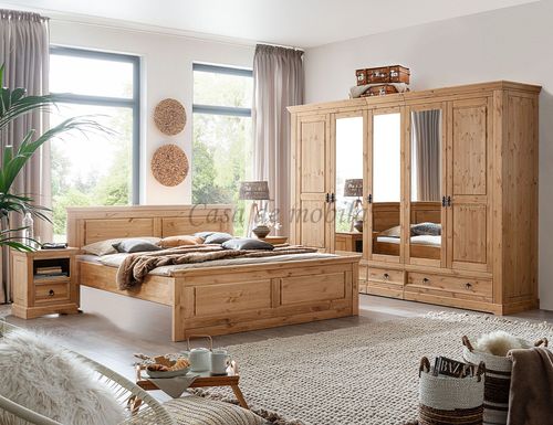 Ein edel und hochwertig verarbeitetes Schlafzimmer, gefertigt aus Kiefernholz. Diese Kombination besticht durch ihre hohe Vielseitigkeit und Eleganz - Hinzu kommen zwei Nachtschränke, ein Bett ohne Lattenrost, sowie ein Kleiderschrank, 4-türig - für einen edlen Vollholz-Look. Massive Kiefer zieren diese Massivholz-Möbelstücke. Hergestellt aus bestandsgepflegten Forsten, bietet diese Kombination das Maximale an Wohnkomfort und überzeugt in ihrer herausragenden Qualität. In diesen schicken Möbelstücken steckt viel Handarbeit und Liebe zum Detail. Dieses lebendige Naturprodukt zeichnet sich durch seine unverwechselbaren Echtheitsmerkmale aus - Maserungen, Verwachsungen, Unregelmäßigkeiten sowie Spannungen sind typische Eigenschaften und Sie dürfen sich somit auf ein echtes Unikat freuen.