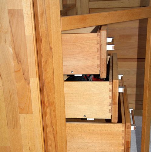 links: 1 breite Holztür mit einem Holzeinlegeboden und 3 Schubladen