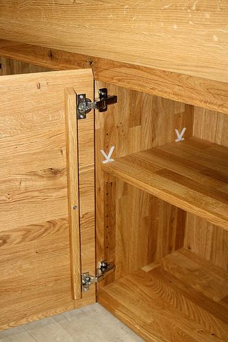 • Lochreihenbohrung für Anzahl Einlegeböden: durchgehende Lochreihenbohrung hinter Holztüren und 3er Lochreihenbohrung hinter Glastüren