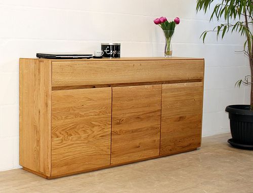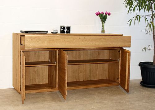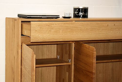 Das Sideboard NYON wird mit 3 Holztüren und 1 breiten Doppel-Schublade mit viel Stauraum geliefert und kann im Wohnzimmer oder Esszimmer aufgestellt werden. Optional sind zusätzlich zu den vorhandenen Einlegeböden auch weitere Einlegeböden sowie Besteckeinsätze lieferbar.