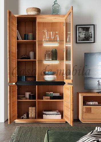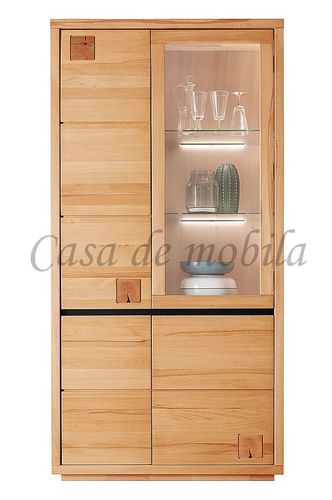 Eine edel und hochwertig verarbeitete Vitrine, gefertigt aus natur geölter Kernbuche. Diese Vitrine besticht durch ihre hohe Vielseitigkeit und Eleganz - Hinzu kommen eine Glastür, drei Holztüren, sowie zwei Glaseinlegböden und drei Holzeinlegeböden. Sämtliche Applikationen sind in elegantem Schwarz gehalten, für den besonderen Eyecatcher sorgen Hirnholzeinsätze. Hergestellt aus bestandsgepflegten Forsten, bietet diese Schrank-Vitrine das Maximale an Wohnkomfort und überzeugt in ihrer herausragenden Qualität. In diesem schicken Möbelstück steckt viel Handarbeit und Liebe zum Detail. Dieses lebendige Naturprodukt zeichnet sich durch seine unverwechselbaren Echtheitsmerkmale aus - Maserungen, Verwachsungen, Unregelmäßigkeiten sowie Spannungen sind typische Eigenschaften und Sie dürfen sich somit auf ein echtes Unikat freuen.