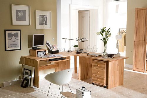 Das Büromöbelset aus Naturholz besteht aus einem Eck-Schreibtisch und einem Rollcontainer.