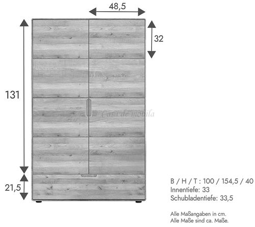 • Türen: zwei große Türen mit einem Fach, das durch breite Einlegeböden in 3 Fächer unterteilt ist und zusätzlichen Stauraum bietet