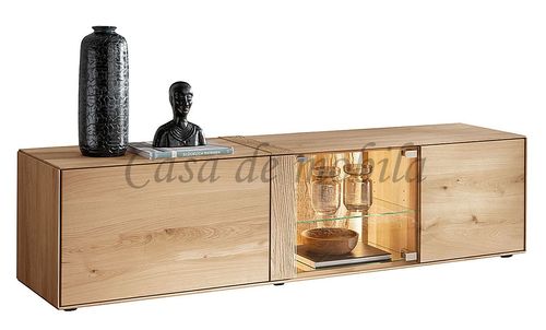 Das TV-Lowboard ist mit zwei Holzklappen und einer Glastür ausgestattet. Hinter der Glastür befinden sich ein Glas-Einlegeboden, hinter den Klappen je ein Holz-Einlegeboden.