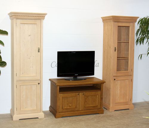 Diese Wohnkombination VICTORIA vereint klassischen Landhausstil mit der Wertigkeit massiver Handwerksmöbel. Gefertigt aus massivem Fichtenholz, überzeugt die Serie durch ihre robuste Bauweise, charakteristische Profilierungen und liebevoll ausgearbeitete Details. Die Kombination aus Hochschrank, Vitrine und einem TV-Lowboard schafft ein harmonisches Gesamtbild und bietet zugleich vielseitigen Stauraum für Wohn- und Medienbereiche.