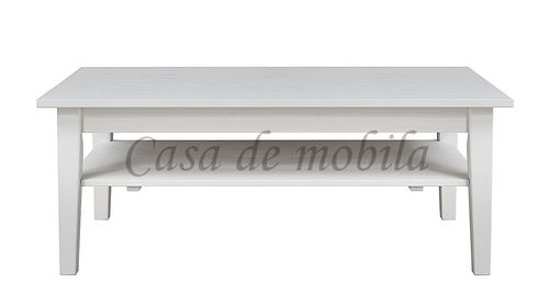 Der Couchtisch hat eine rechteckige Tischplatte und einen Ablageboden.
