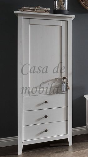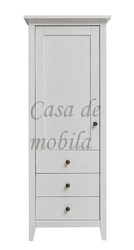 Das Highboard hat eine Holztür mit zwei Einlegeböden sowie drei Schubladen.
