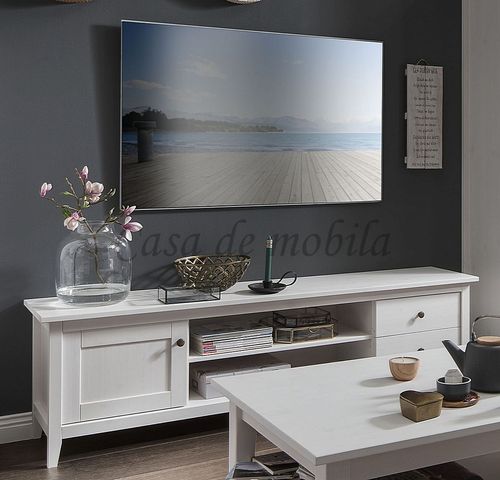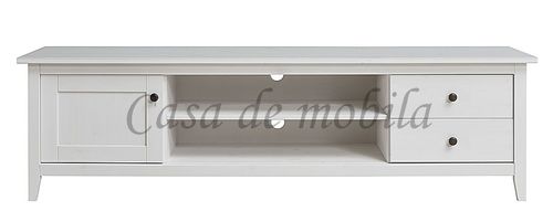 Das Lowboard hat eine Holztür, zwei Schubladen und ein offenes Fach mit einem Einlegeboden.