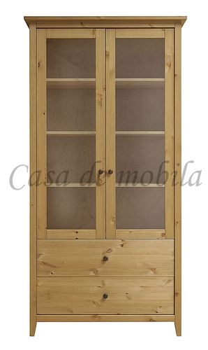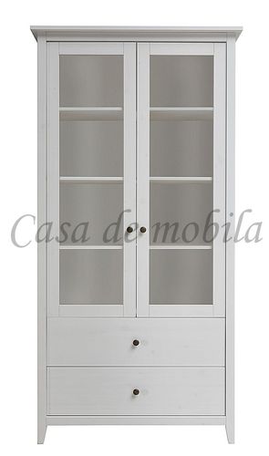 Die Vitrine hat zwei Glastüren mit drei breiten Einlegeböden sowie zwei breite Schubladen.